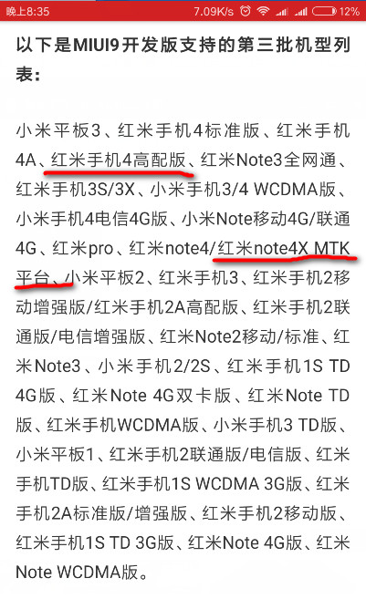 而红米4顶配则是第三批感受MIUI9的型号,而且和红米notenote 4C(MTK服务平台)同一批号。