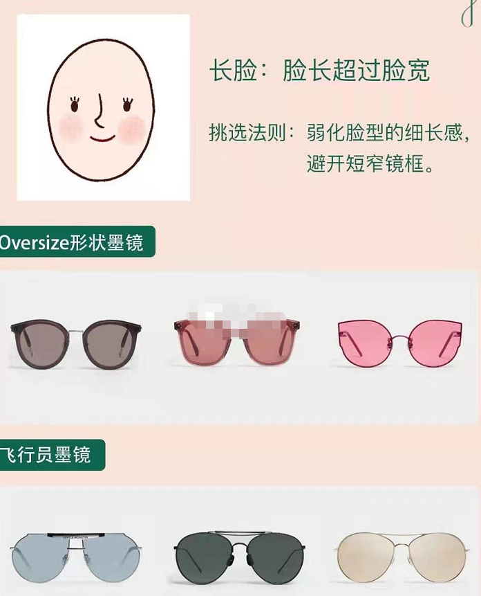 这类人的面部纵向长度比面部宽度要长很多,需要通过墨镜弱化脸型到现场看,千万避免短窄镜框,更需要通过镜框来强调脸型的宽度。