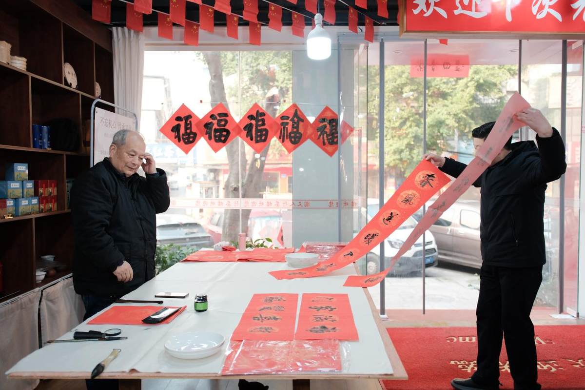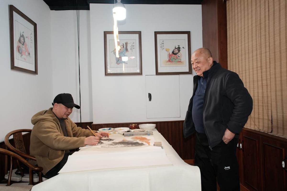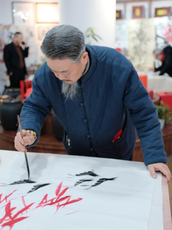 书法名家戴午桥与国家一级美术师袁引现场挥毫,铺展红纸书写春联、福字,将新春祝福与书法艺术精妙相融,免费赠予过往行人与邻里宾客。其余七位书画大师则各施所长,现场创作兼具艺术价值与吉祥寓意的佳作,为茶楼增添文人墨气。
