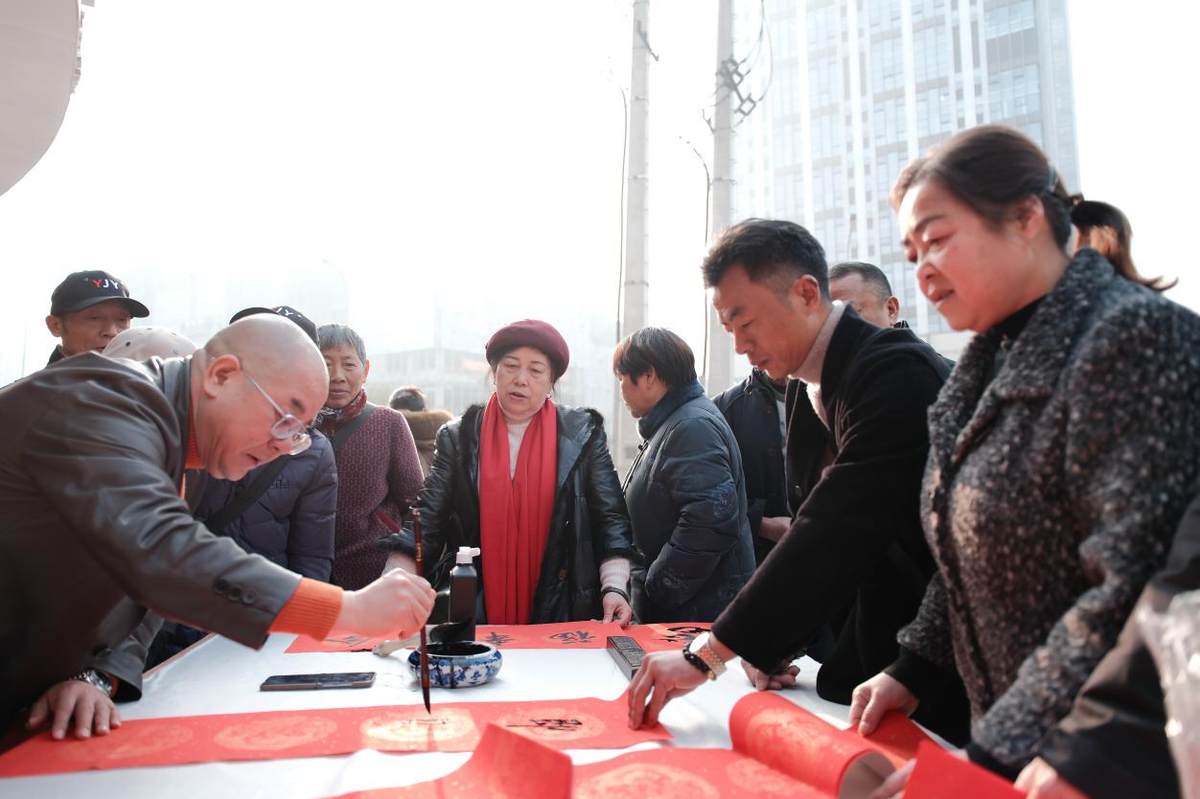 活动现场,茶香与翰墨交辉,艺术气息氤氲流转。往来行人为现场的热闹氛围所吸引,纷纷驻足凝神,共赏九大名家笔酣墨饱的艺术风采,欢声笑语间满是祥和迎春的浓厚氛围。