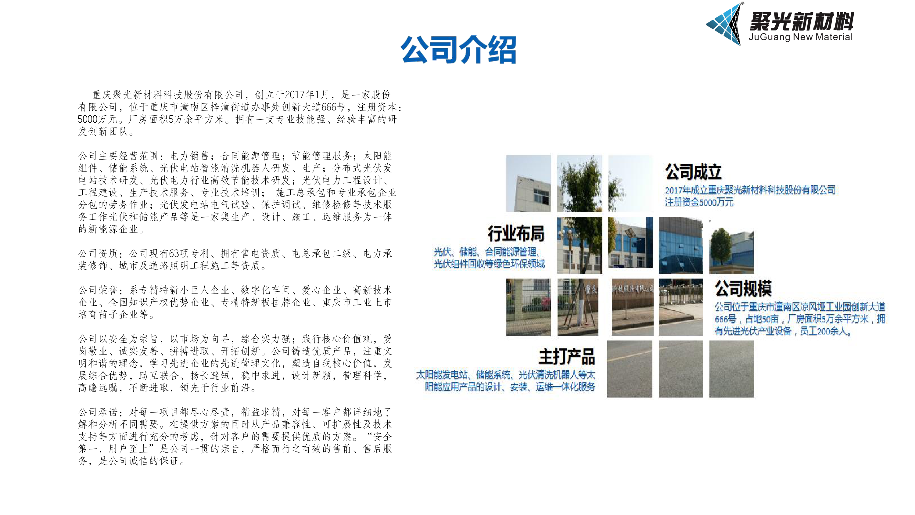 重庆聚光新材料科技股份有限公司是一家集光伏、储能相关产品生产,以及光伏电力工程设计、施工、运维服务为一体的新能源企业,综合实力突出,行业竞争力显著。